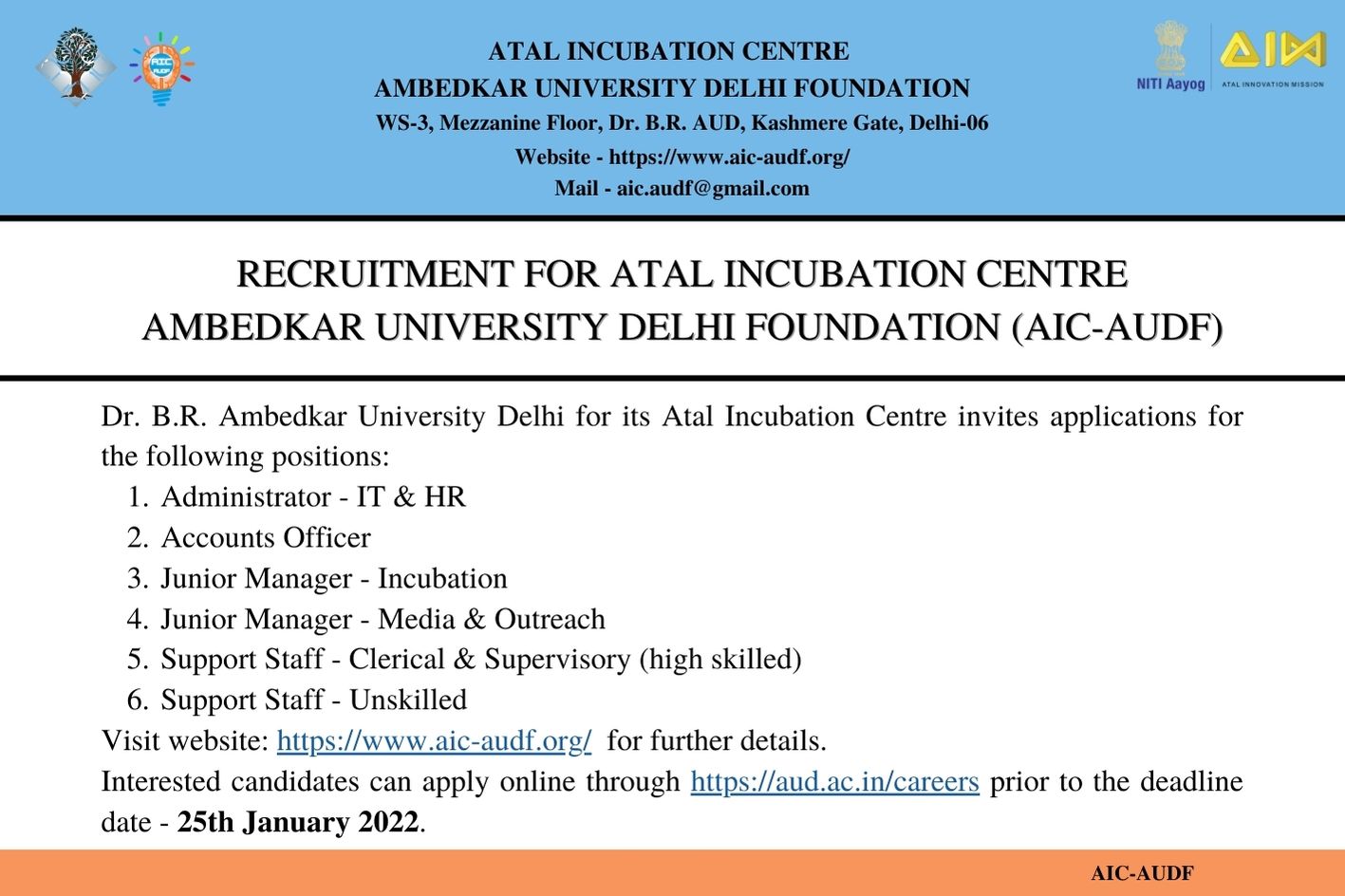 Detailed Advertisement for recruitment of Manpower for AIC-AUDF