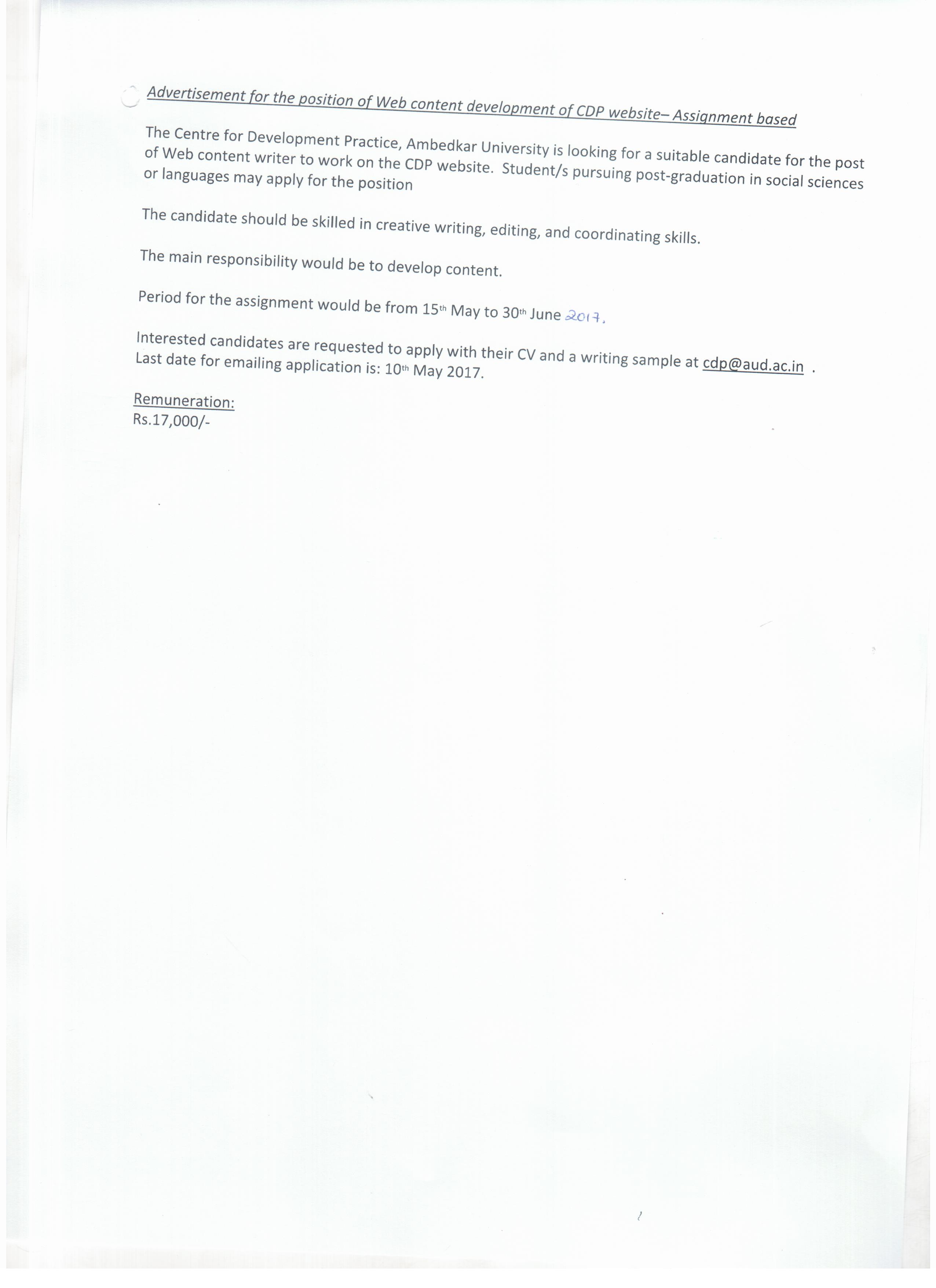 Advertisement for Research Associate Position CDP( Centre for Development Practice)